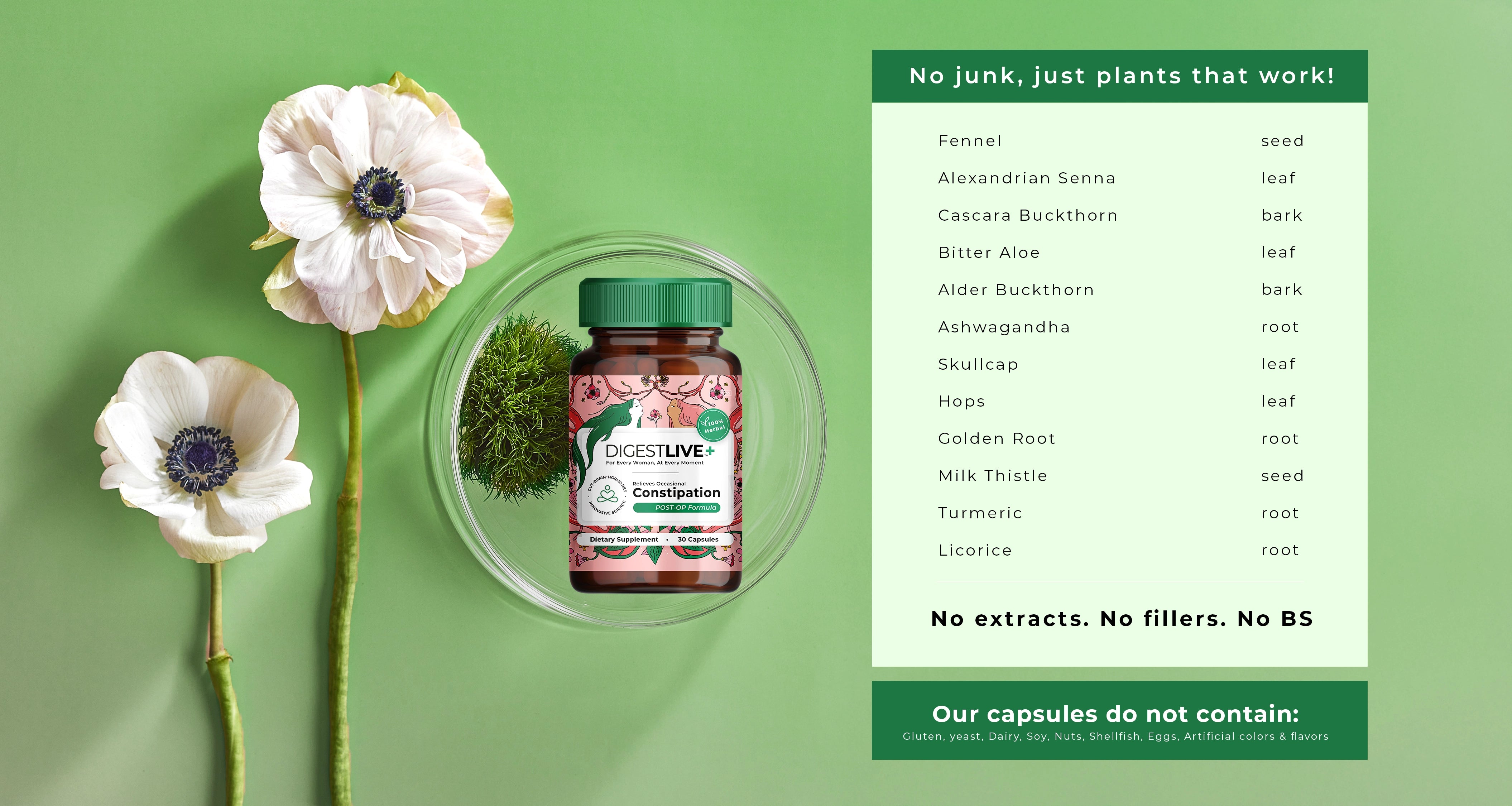 Digestlive is specifically formulated to support the unique gut-brain-hormone connection in women, offering a holistic solution for female digestion. That said, if men take Digestlive, they can still benefit from the powerful, pure herbs that naturally support overall gut health and balance. Everyone deserves a healthier, happier gut — our formula simply speaks first to a woman’s body.