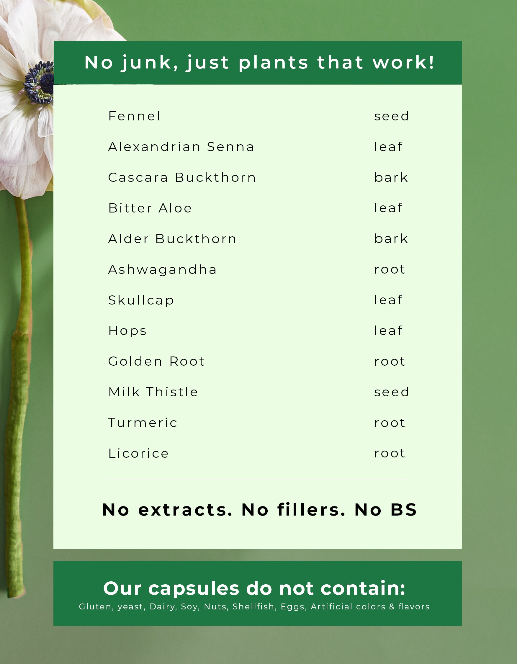 Gentle herbal relief: smoother, more comfortable bowel movements without harsh laxatives or strain.